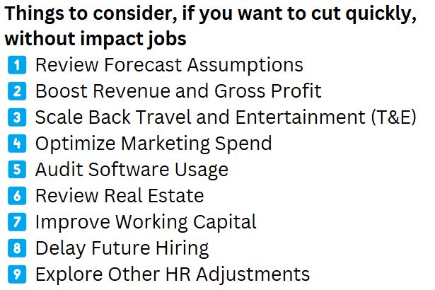 Before cutting costs, explore opportunities to boost revenue or gross profit. Consider pricing adjustments, upselling or cross-selling strategies, and accelerating the launch of high-margin products or services. This should already be happening, but there may be some trends that are not fully captured in the forecast.